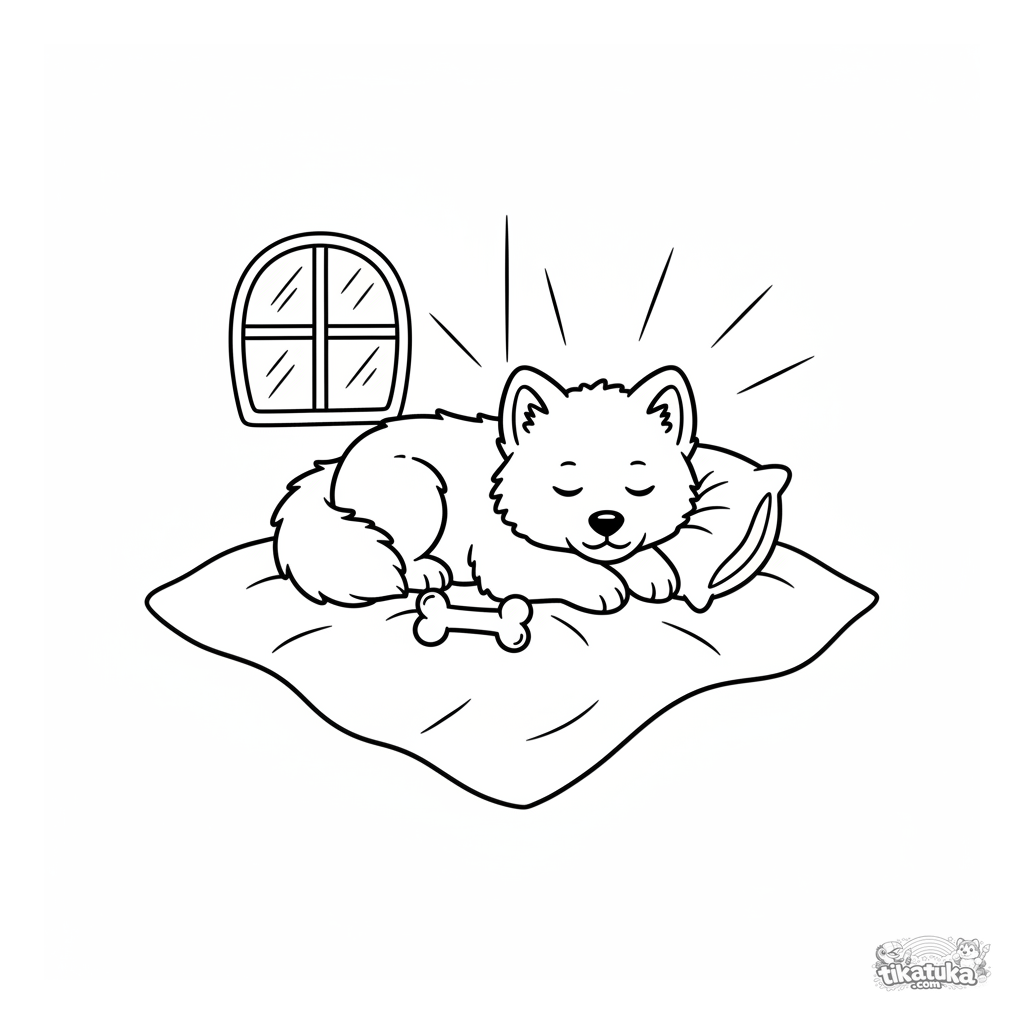 Página para colorir para crianças pequenas: um filhote de samoieda fofo dormindo profundamente em um cobertor aconchegante. Formas simples e grandes perfeitas para crianças de 2-3 anos.