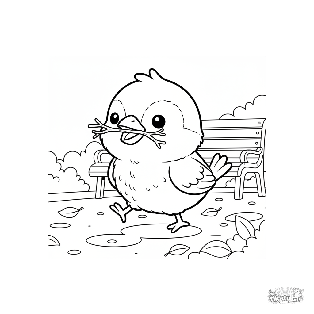 Página para colorir para crianças de 4-6 anos: um pintinho de pardal fofinho coleta gravetos para um ninho em um parque da cidade.