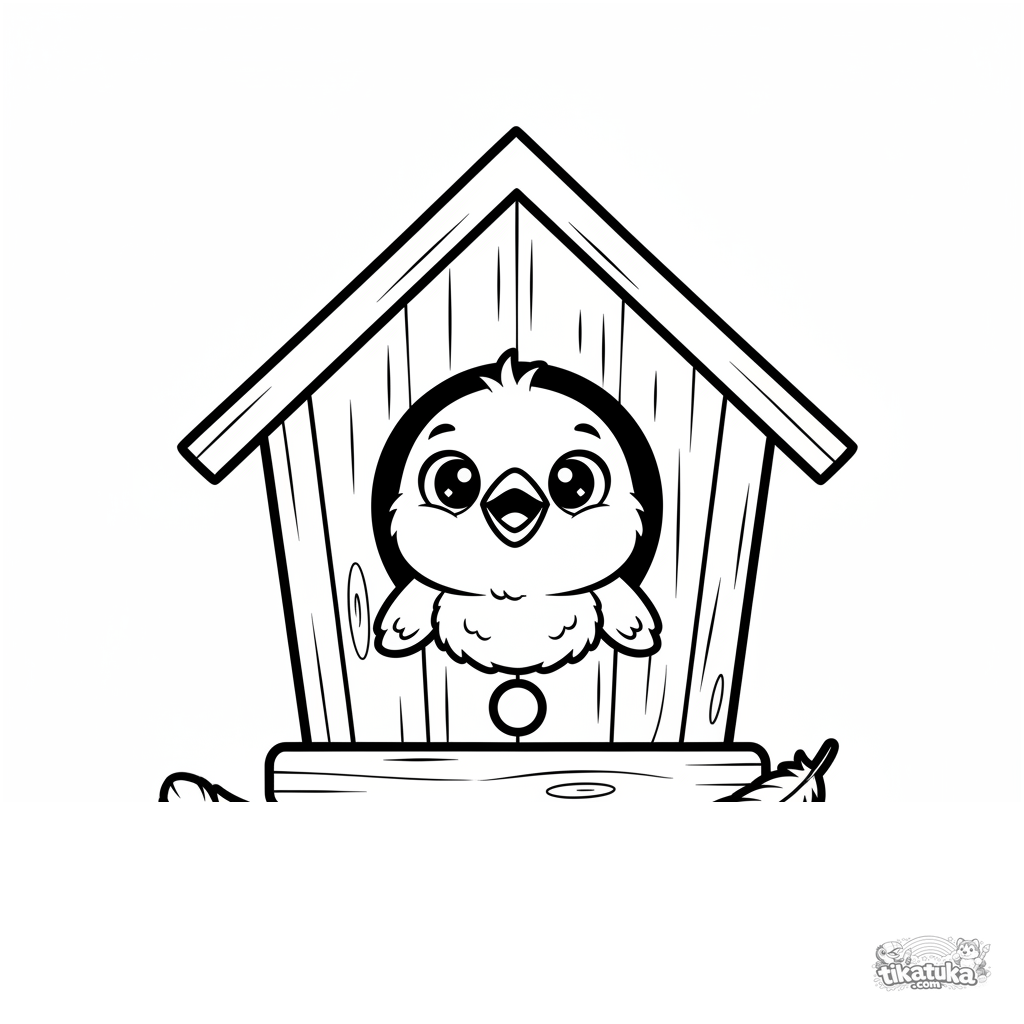 Página para colorir para crianças pequenas: um pintinho de pardal fofinho espiando pela janela redonda de uma casinha de pássaros de madeira.