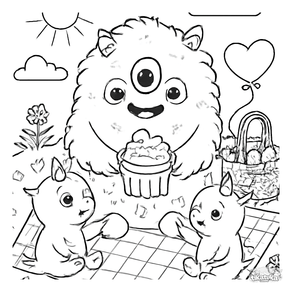 Página para colorir de um monstro fofinho de três olhos em um piquenique com amigos. Para crianças de 6 a 9 anos. Cena de prado com cobertor xadrez, cesta e balão em forma de coração.
