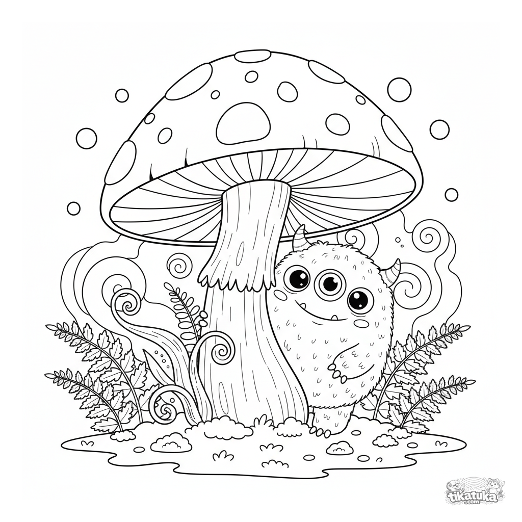 Página para colorir para crianças de 5-8 anos: um monstro fofinho de três olhos brinca de esconde-esconde atrás de um cogumelo grande.