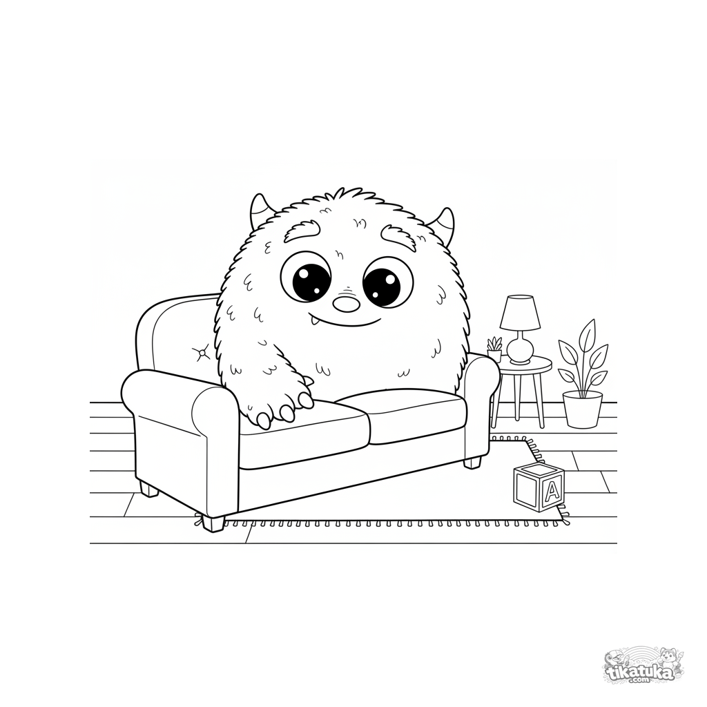 Página para colorir para crianças de 4 a 6 anos: um monstro fofinho de três olhos espreita timidamente atrás do sofá. Expressão engraçada e amigável, um bloco tombado.