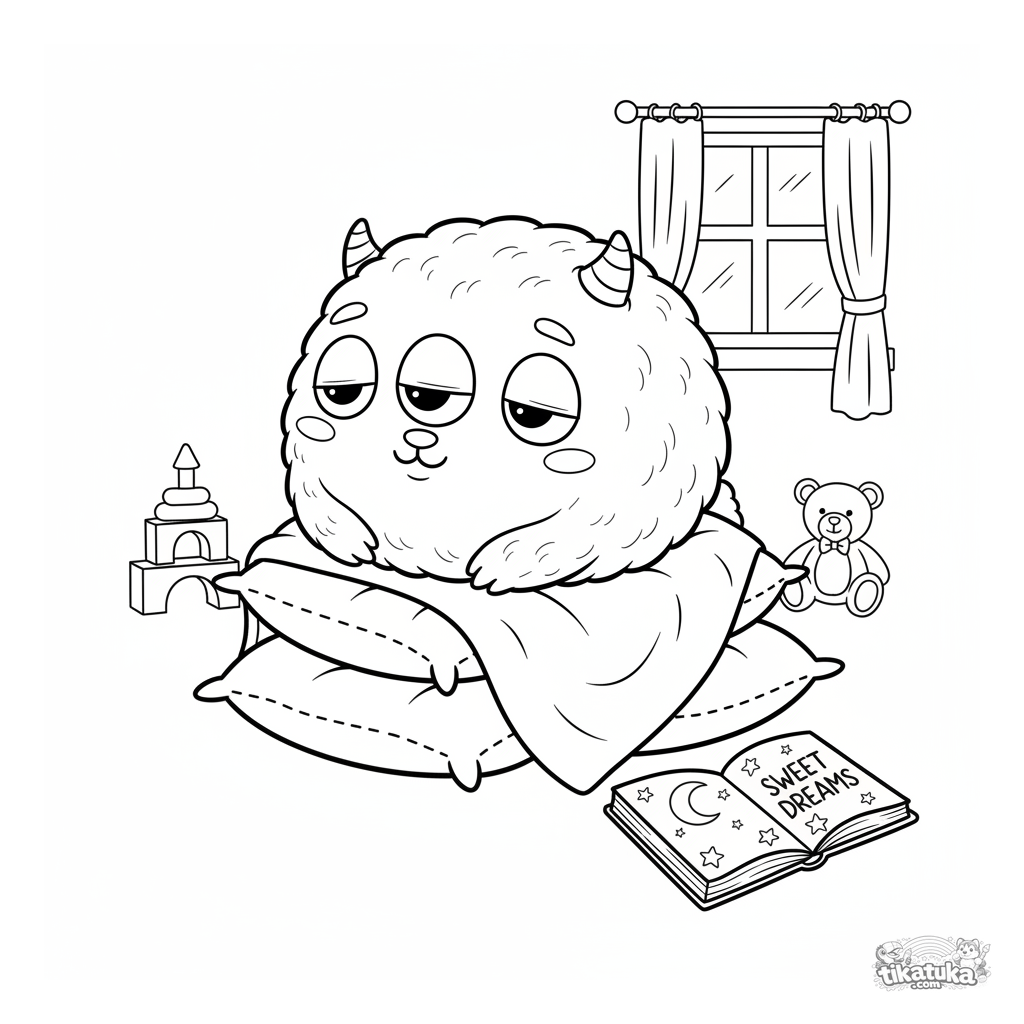 Página para colorir para crianças: um monstro fofinho e amigável de três olhos dormindo em um forte de travesseiros. Estilo de desenho animado fofo.