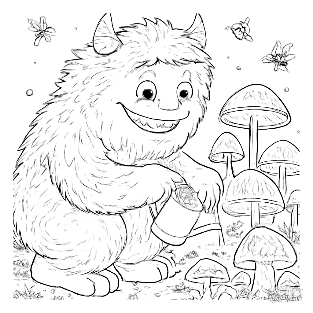 Página para colorir difícil de um monstro fofinho regando um jardim mágico de cogumelos brilhantes. Para crianças de 8 a 12 anos.