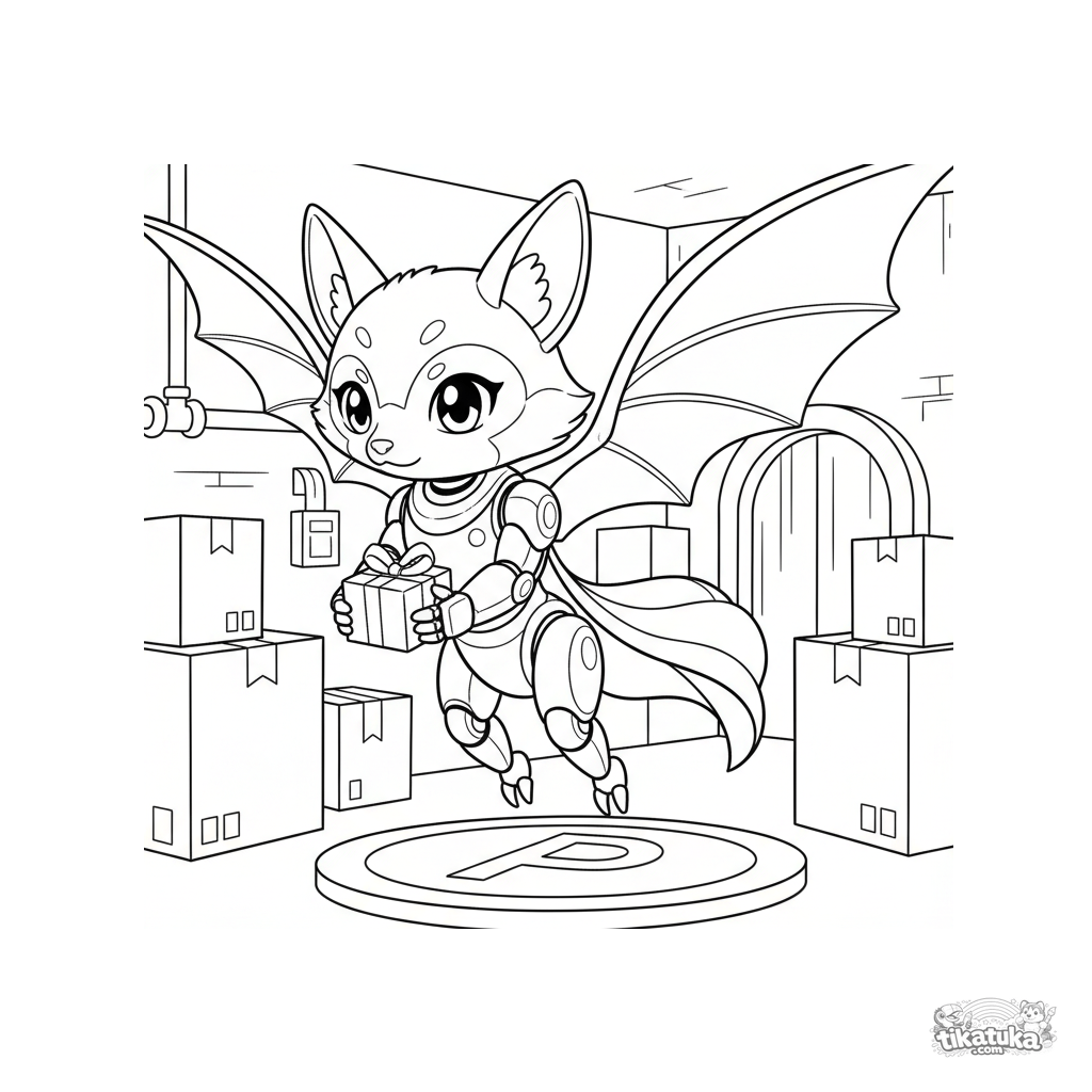 Página para colorir de um robô drone em forma de raposa voadora entregando uma encomenda em um armazém. Para crianças de 7 a 9 anos.