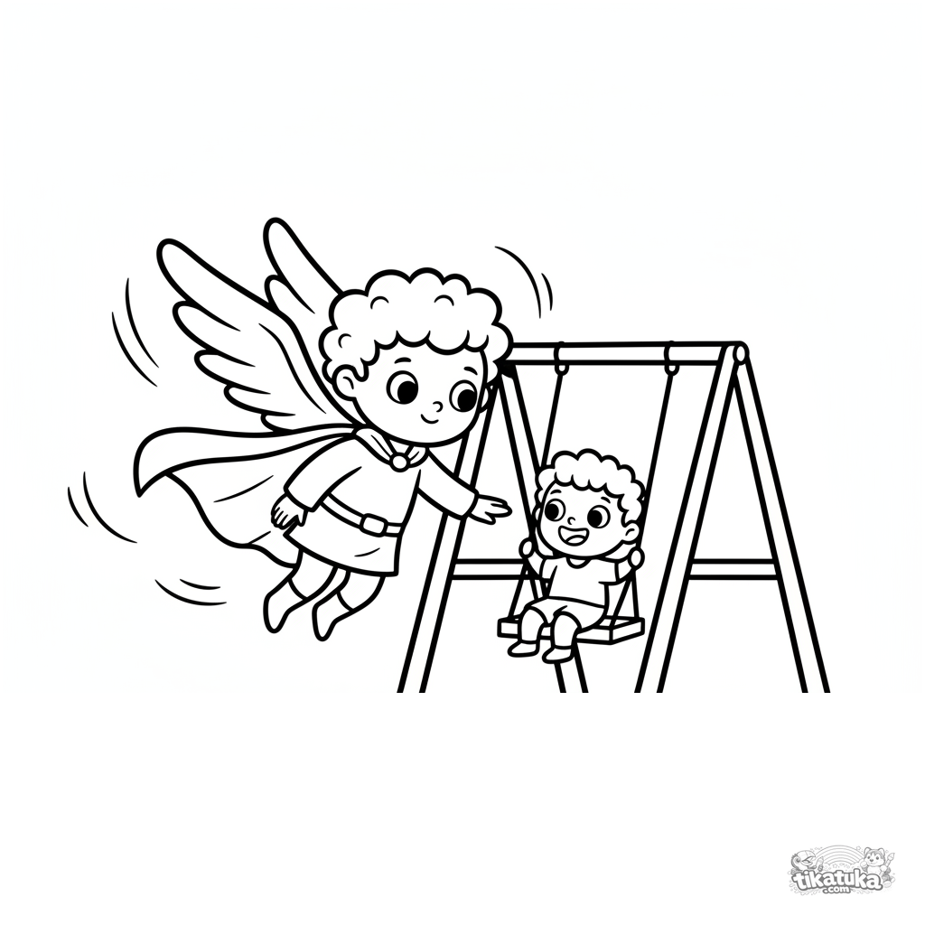 Página para colorir para bebês 2-3: um super-herói voador com asas de penas pousa suavemente em um balanço de playground para ajudar.