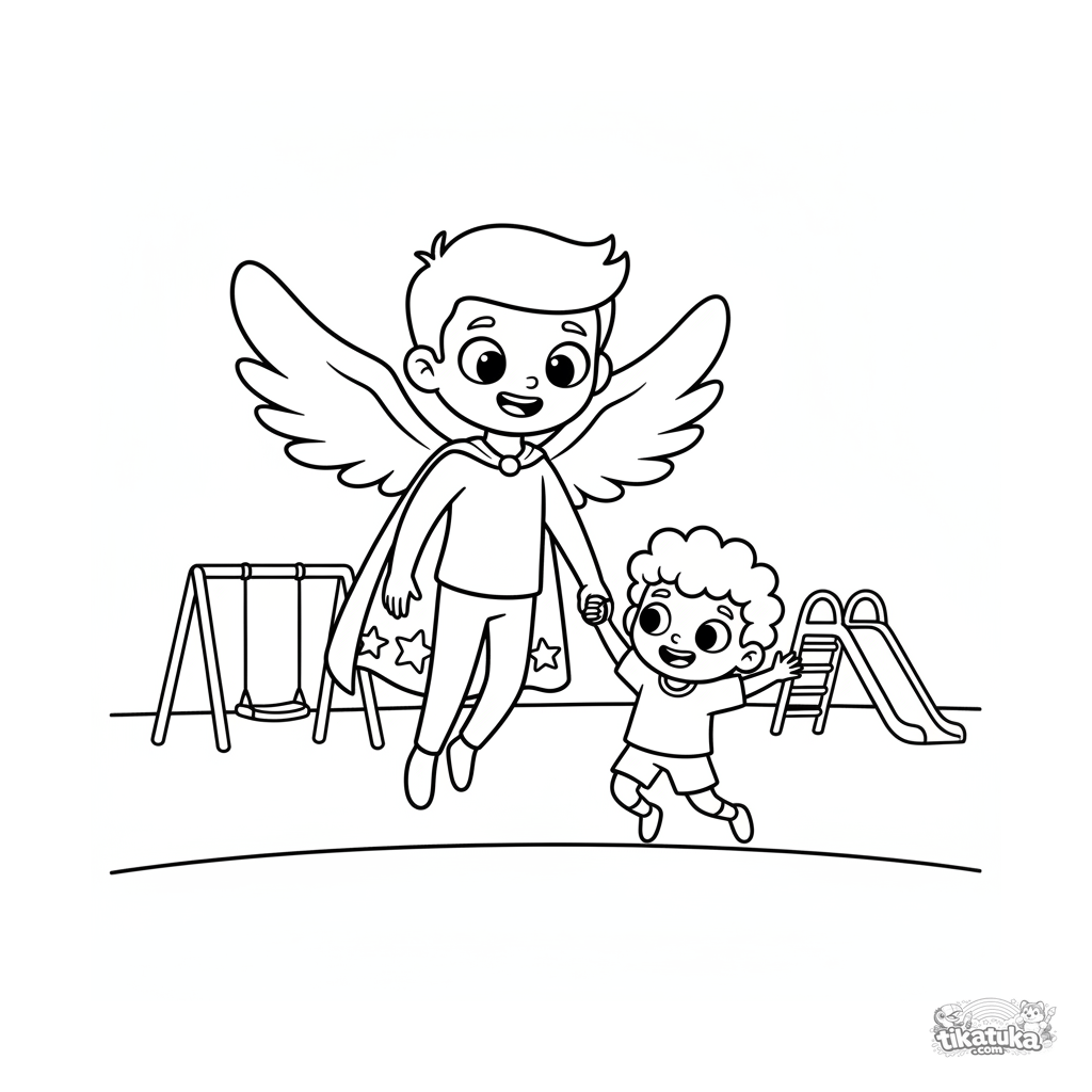 Página para colorir simples para crianças pequenas 2-3: um herói voador com asas ajuda uma criança a pular em um playground escolar.