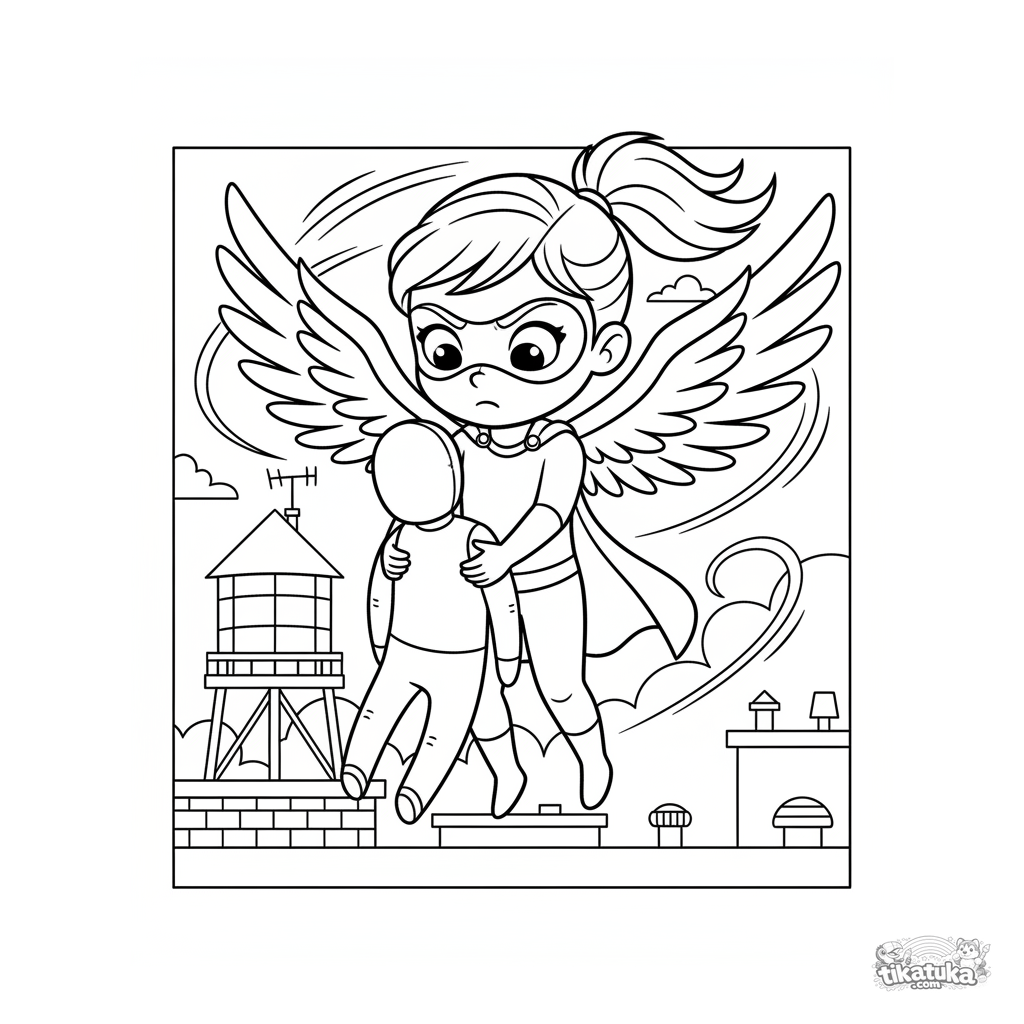 Página para colorir para crianças 7-9: um super-herói voador treina levantando um manequim em um telhado. Cena dinâmica com asas.