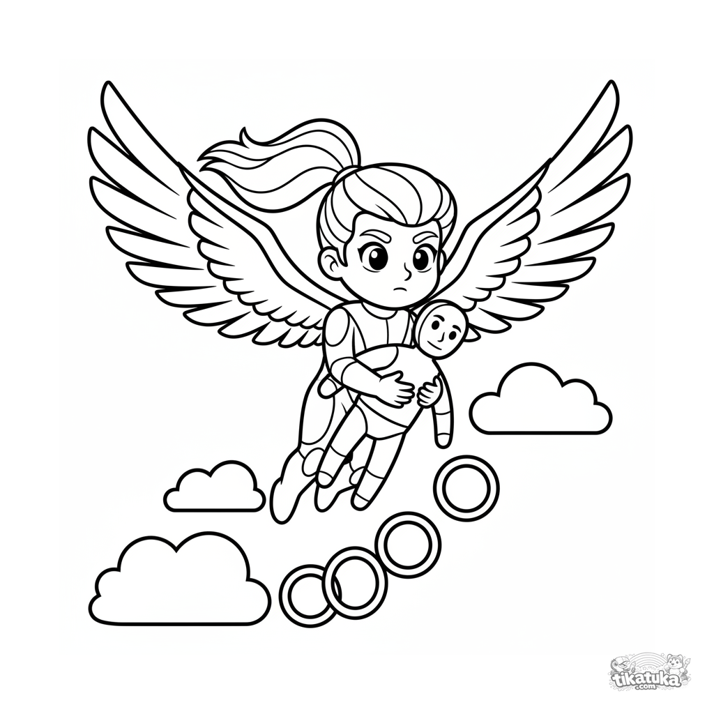 Página para colorir para crianças pequenas 2-3: um super-herói voador com asas grandes treina em um curso seguro. Formas simples e grandes.