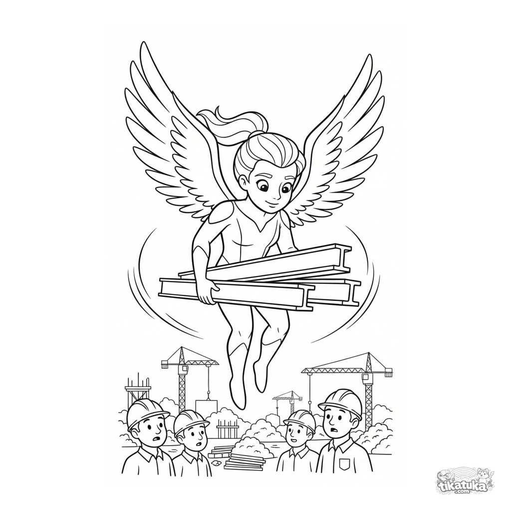 Página para colorir para crianças 4-6: um super-herói com grandes asas de penas abaixa vigas de construção em um canteiro de obras. Cena de resgate em estilo cartoon clássico.