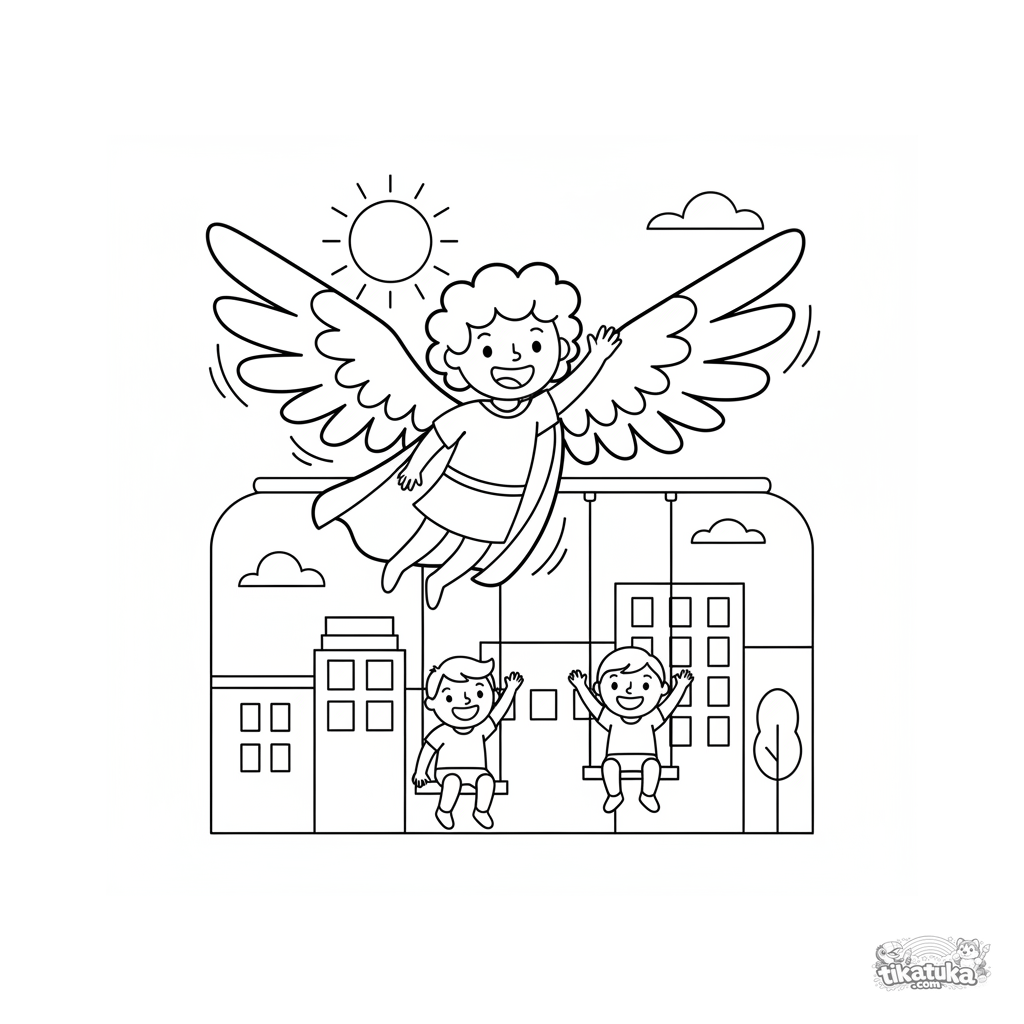 Página simples para colorir para bebês: um super-herói voador com asas pairando sobre um playground da cidade. Formas grandes, margens amplas, para 2-3 anos.