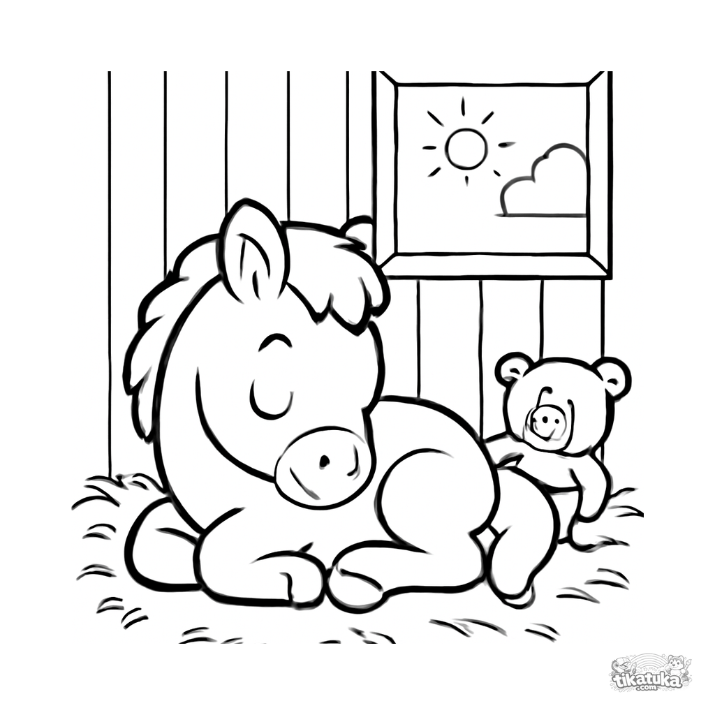 Página para colorir para crianças. Um potro castanho dormindo enrolado sobre palha dourada em estábulo aconchegante com ursinho. Download grátis.