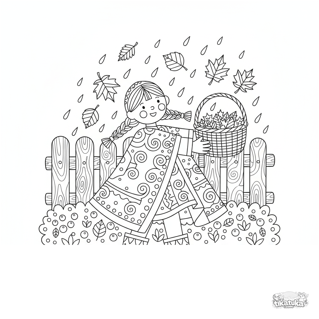 Página para colorir para crianças 4-6 no estilo folclórico: uma criança com uma capa estampada pega folhas caindo em uma cesta sob a chuva de outono.