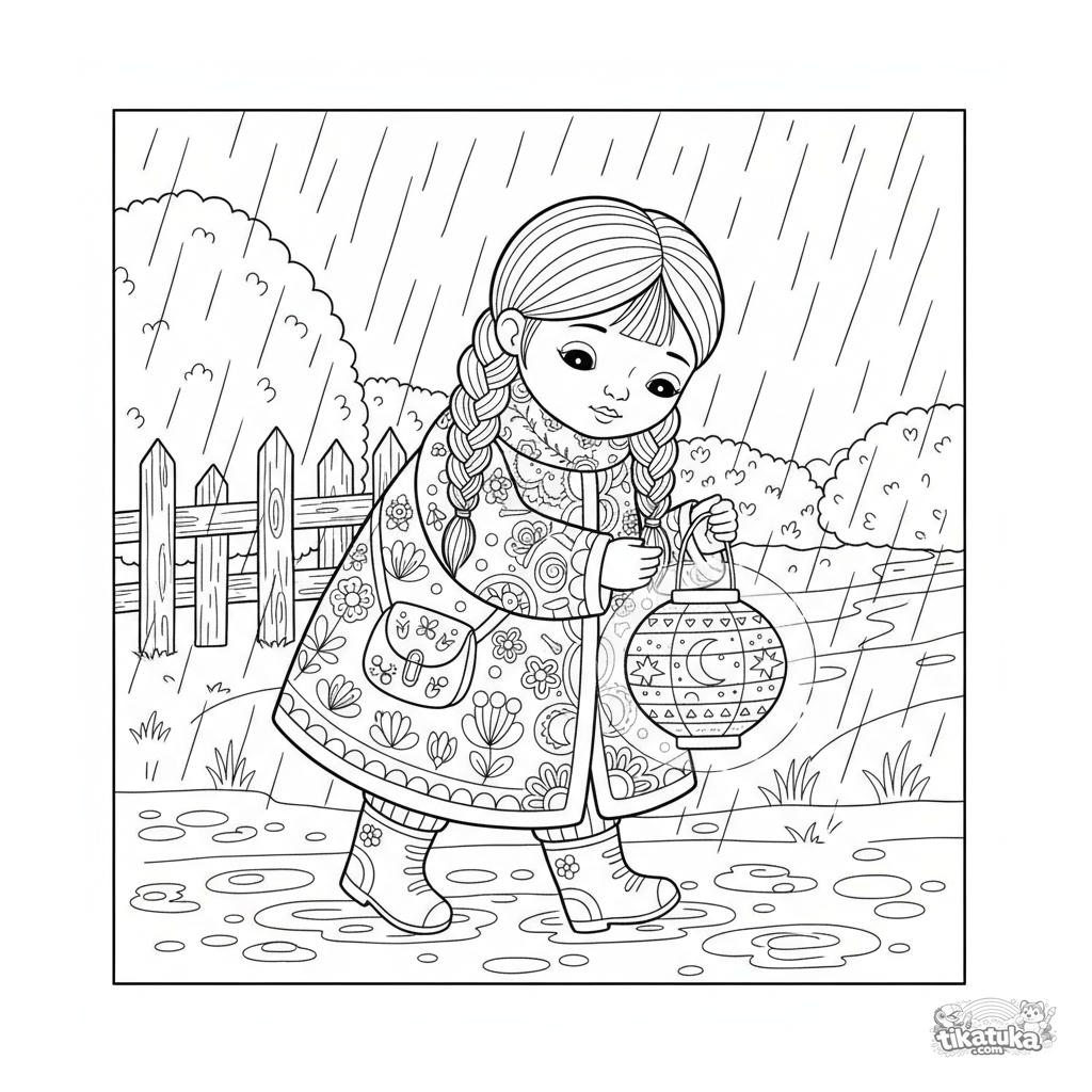 Página para colorir detalhada de arte popular para crianças 10-12: uma criança de casaco estampado caminha com lanterna num caminho lamacento ao anoitecer com chuva outonal.