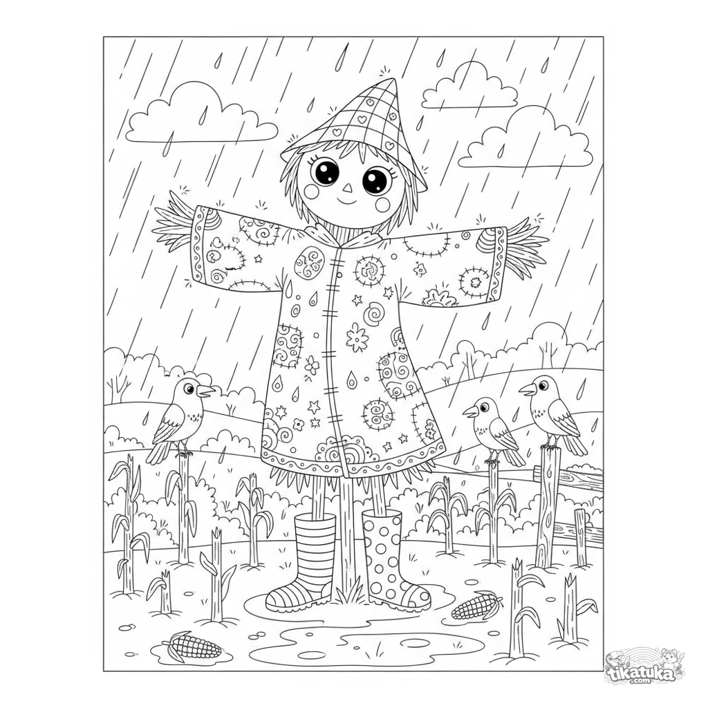 Página para colorir complexa para crianças 10-12: um espantalho em forma de pássaro com botas e chapéu em um campo de outono sob a chuva.