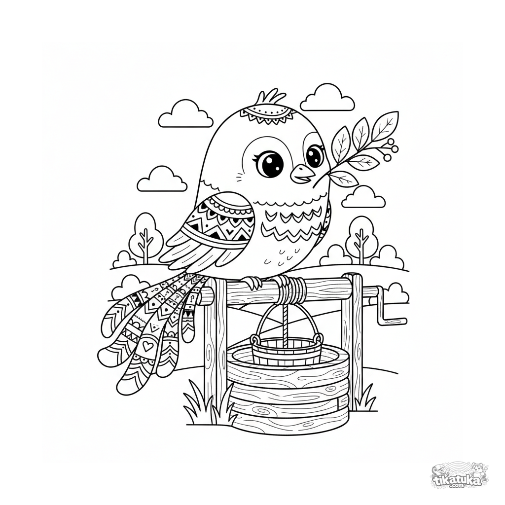 Página para colorir para crianças 7-9: um pássaro mágico com penas padronizadas como bordado folclórico empoleirado no poço de água viva. Detalhes ornamentados, estilo artesanato folclórico.