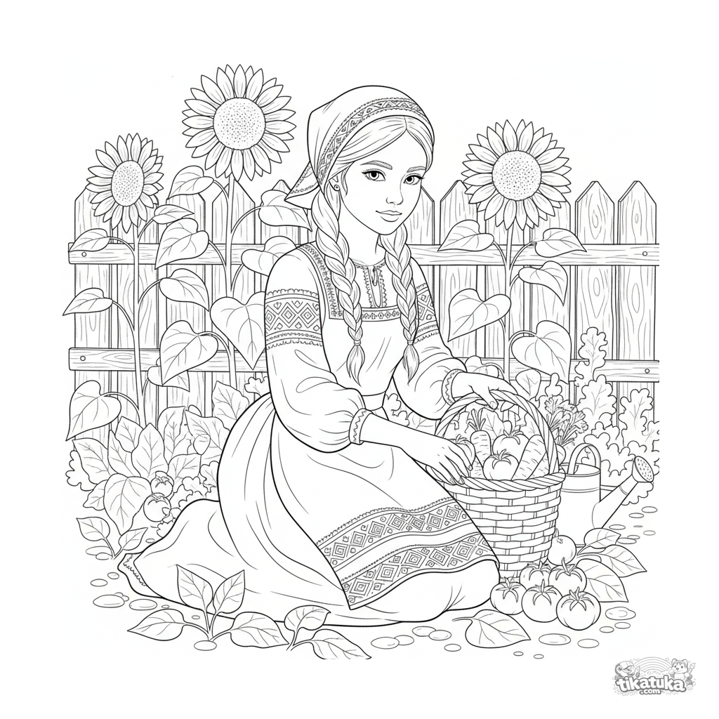 Página para colorir detalhada para 10-12 anos: menina em vestido de bordado folclórico colhendo vegetais em um jardim. Padrões geométricos intrincados e fundo naturalista.