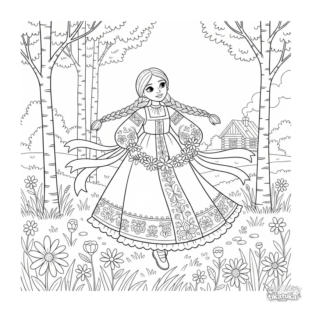 Página para colorir para meninas 10-12: uma garota em um vestido sarafan russo detalhado com bordado folclórico dança em um campo florido, com fitas em suas tranças.