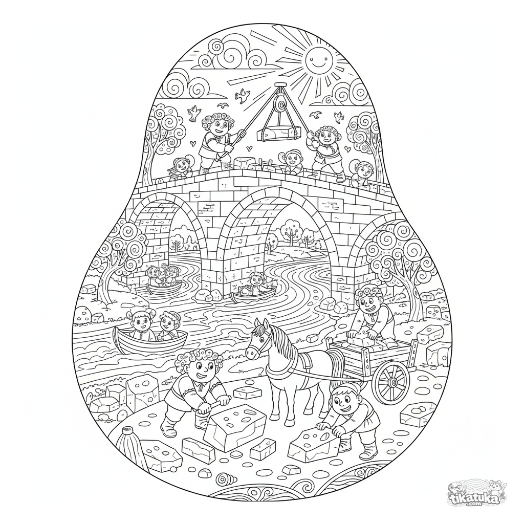 Página para colorir dinâmica de arte popular de trabalhadores construindo uma grande ponte de pedra. Para crianças mais velhas de 7 a 12 anos. Apresenta operários, roldanas, cavalos e barcos no rio.