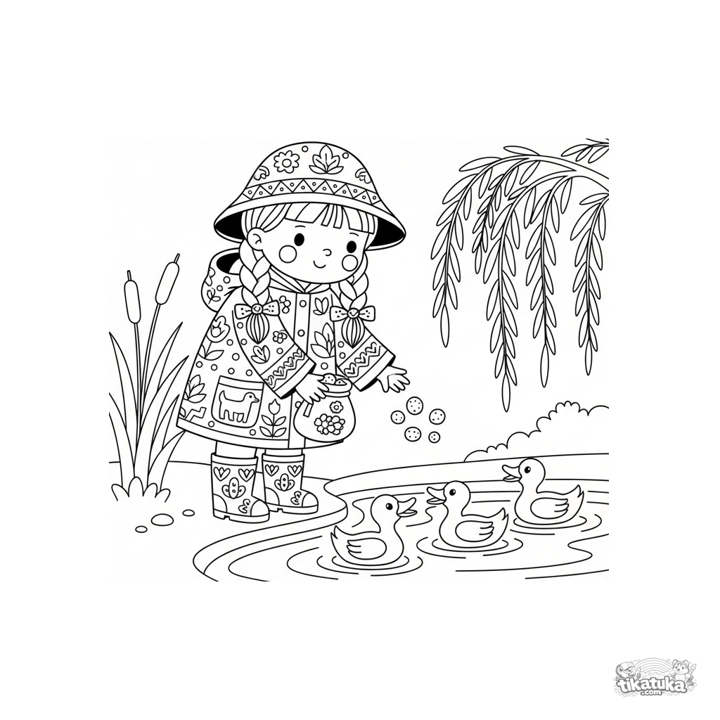 Página para colorir para crianças 7-9 em estilo folclórico: uma criança com capacho estampado alimenta patos em um lago de outono na chuva.