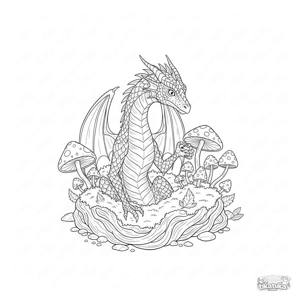 Página para colorir difícil para crianças mais velhas: um dragão da floresta cuida de um jardim de cogumelos brilhantes nas raízes de uma árvore antiga. Muitos detalhes e texturas.