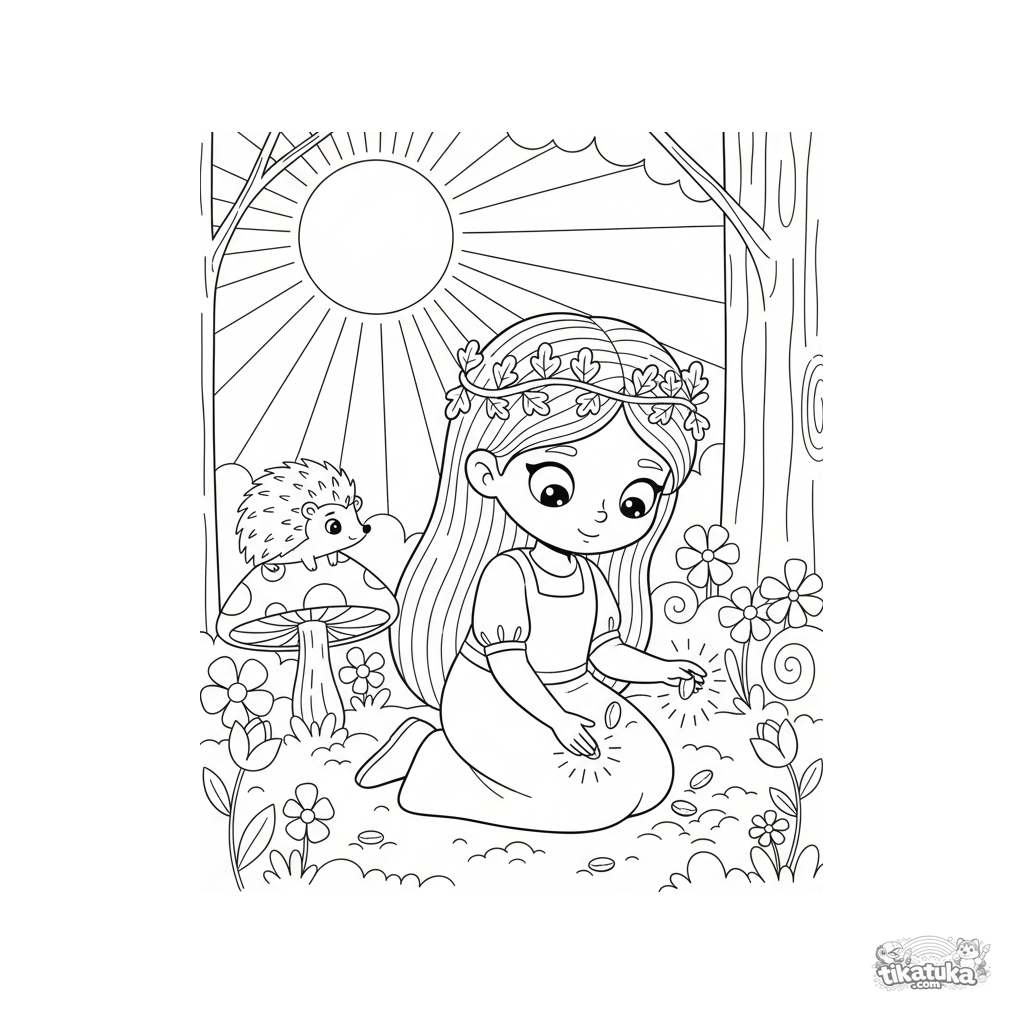 Página para colorir para crianças 4-6: uma princesa da floresta plantando sementes brilhantes em um jardim iluminado pela lua. Um ouriço curioso a observa.