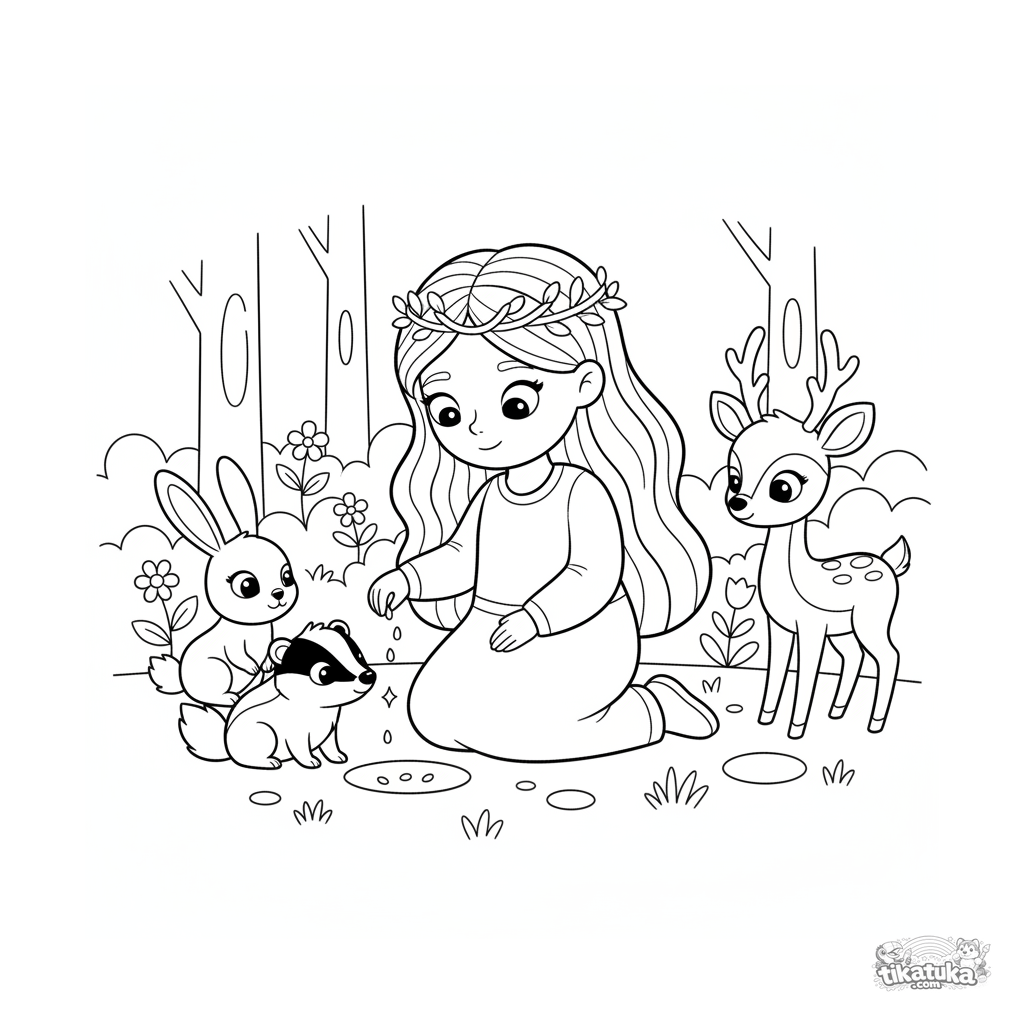 Página para colorir para crianças 7-9: uma princesa da floresta planta sementes mágicas com a ajuda de animais em uma clareira ensolarada.