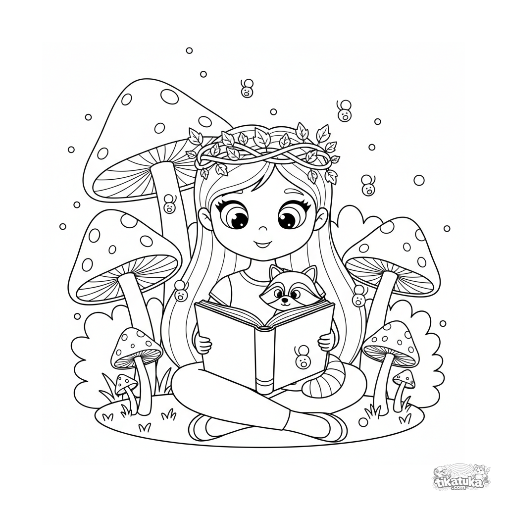 Página para colorir para crianças 4-6: uma princesa da floresta lê um livro para um guaxinim em um círculo de cogumelos brilhantes. Folhas no cabelo, vaga-lumes flutuando.