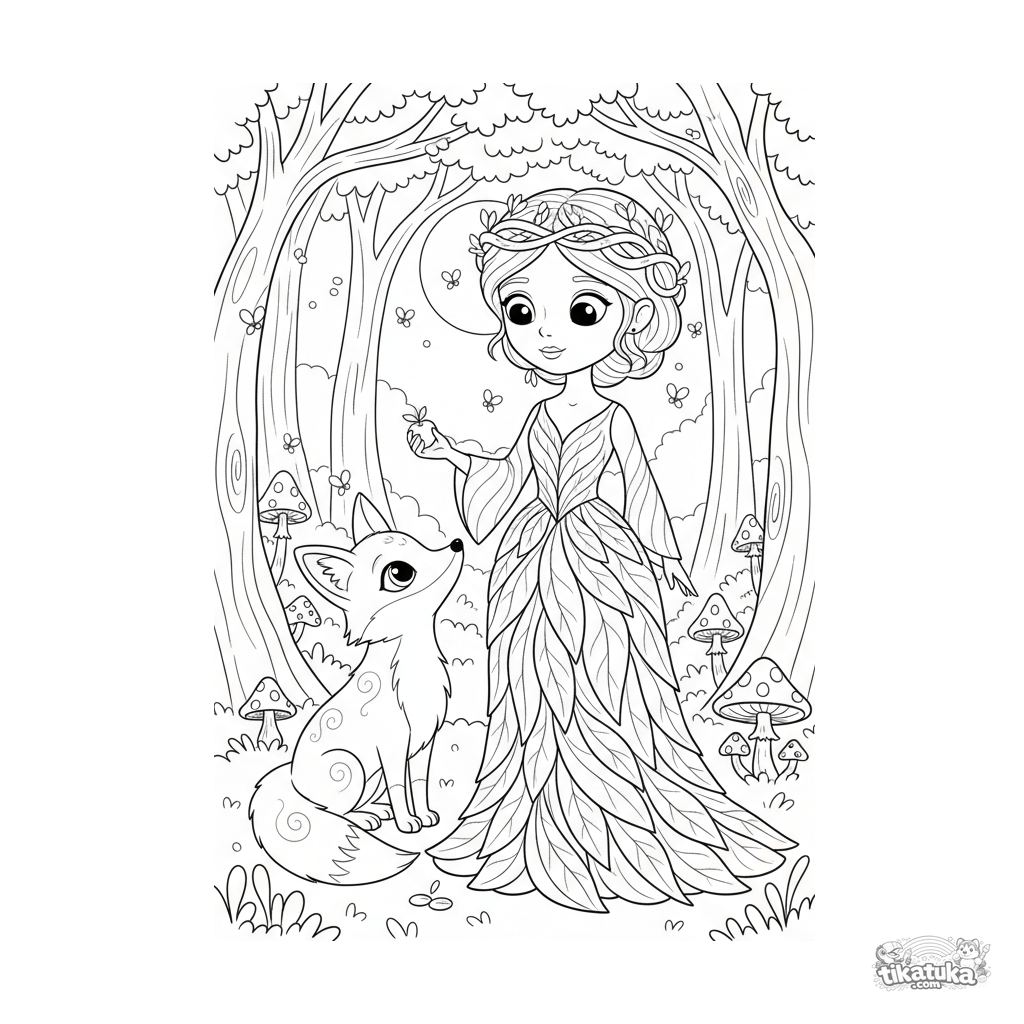 Página para colorir para crianças 7-9: uma princesa da floresta em um bosque iluminado pela lua faz amizade com uma raposa brilhante.