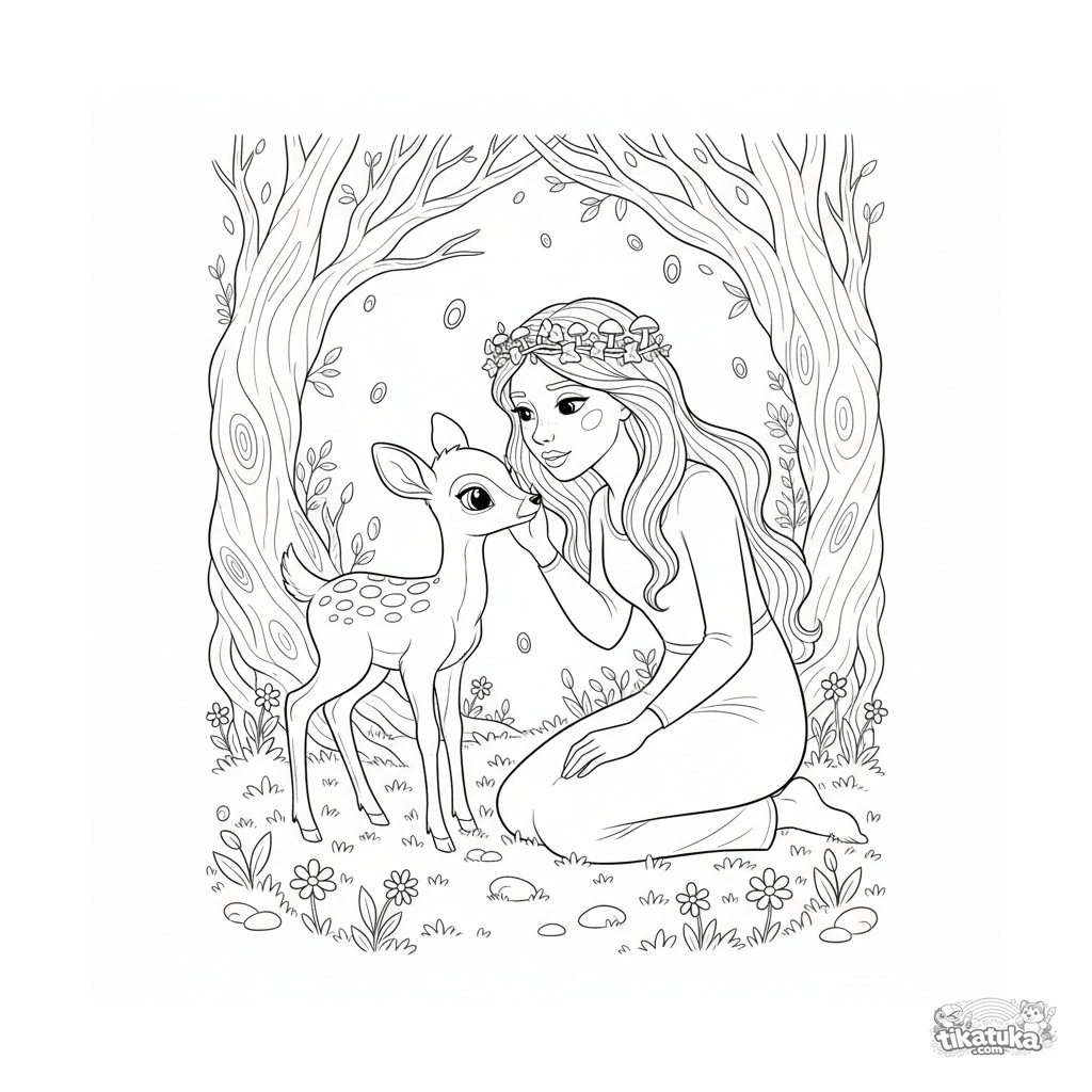 Página para colorir detalhada para crianças 10-12: uma princesa da floresta sussurrando para um filhote de cervo em um bosque encantado sob o luar.