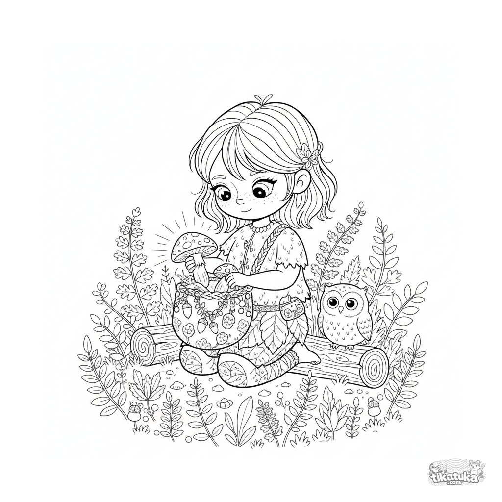 Página para colorir de fantasia para 10-12 anos: uma fada da floresta em uma roupa de aventura colhendo cogumelos em uma floresta encantada, com uma coruja companheira por perto.