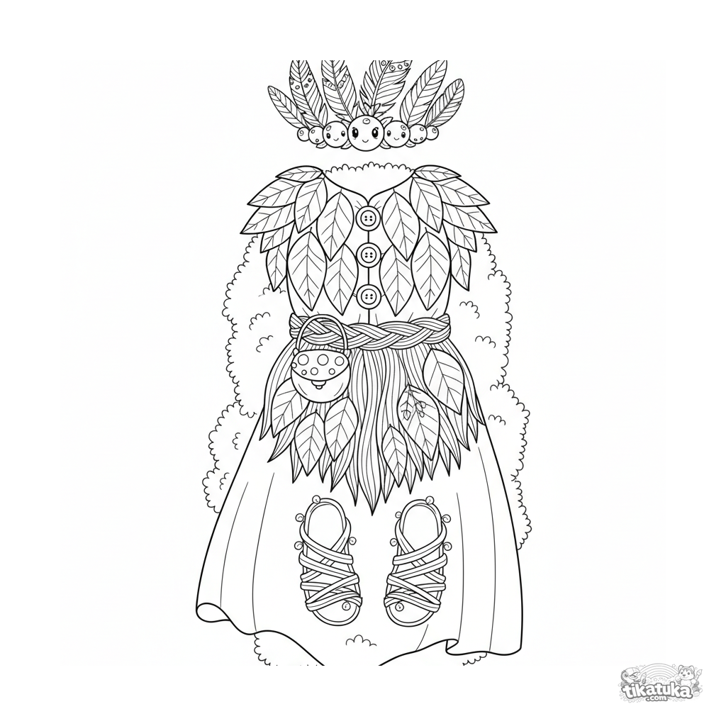 Página para colorir detalhada para meninas 10-12: uma disposição plana de uma roupa mágica da floresta feita de folhas, bolotas e cogumelos sobre musgo macio.