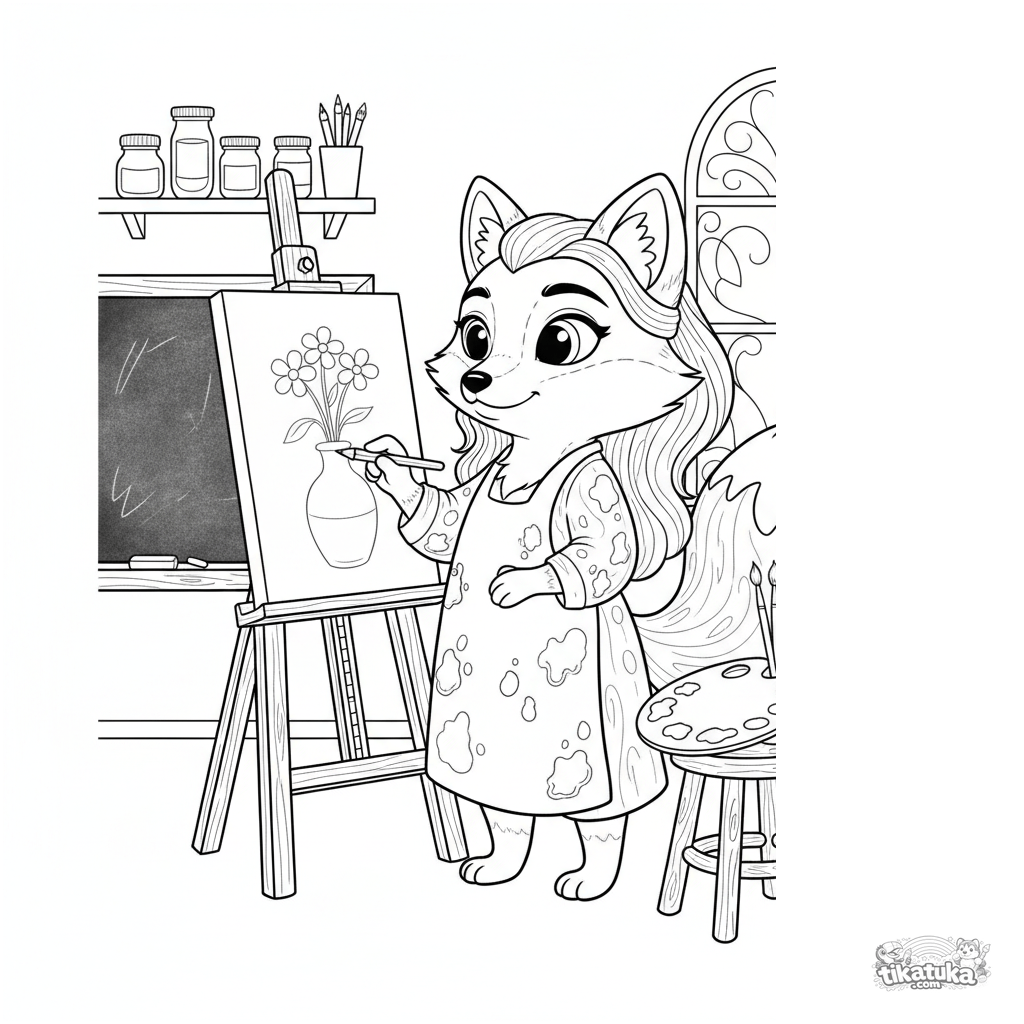 Página para colorir para crianças 7-9: uma raposa professora de arte faz um esboço em um cavalete na sala de aula. Linhas expressivas, elementos art nouveau.