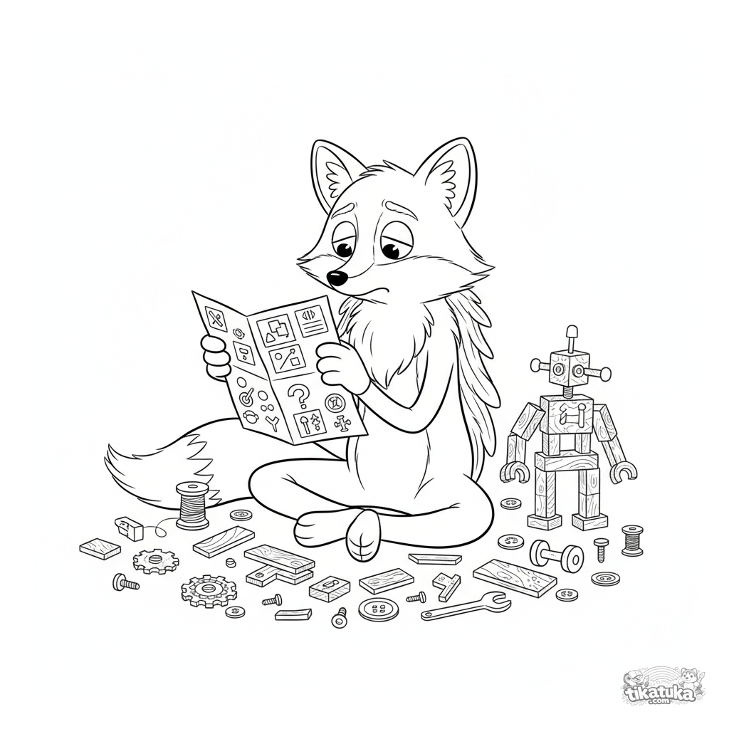 Página para colorir para crianças de 7 a 12 anos: uma raposa olha completamente confusa para uma folha de instruções de montagem enigmática, sentada entre peças espalhadas. Cena caótica e engraçada.