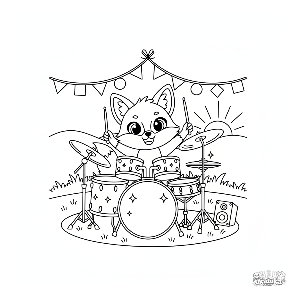 Página para colorir para crianças: uma alegre raposa toca bateria em um gramado de festival ao pôr do sol.