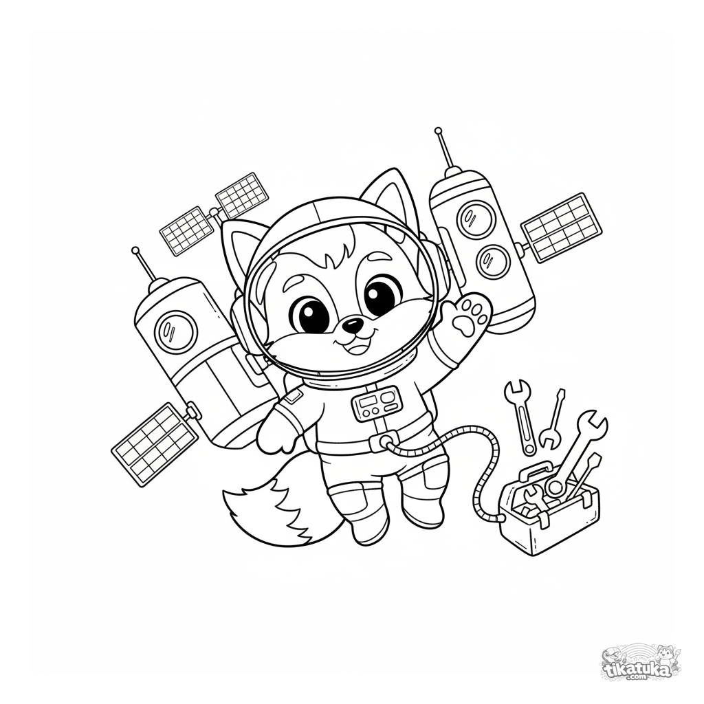 Página para colorir para crianças 4-8: a raposa Foxy em traje espacial flutua perto de uma estação espacial. Contornos limpos, formas simples, cena divertida.
