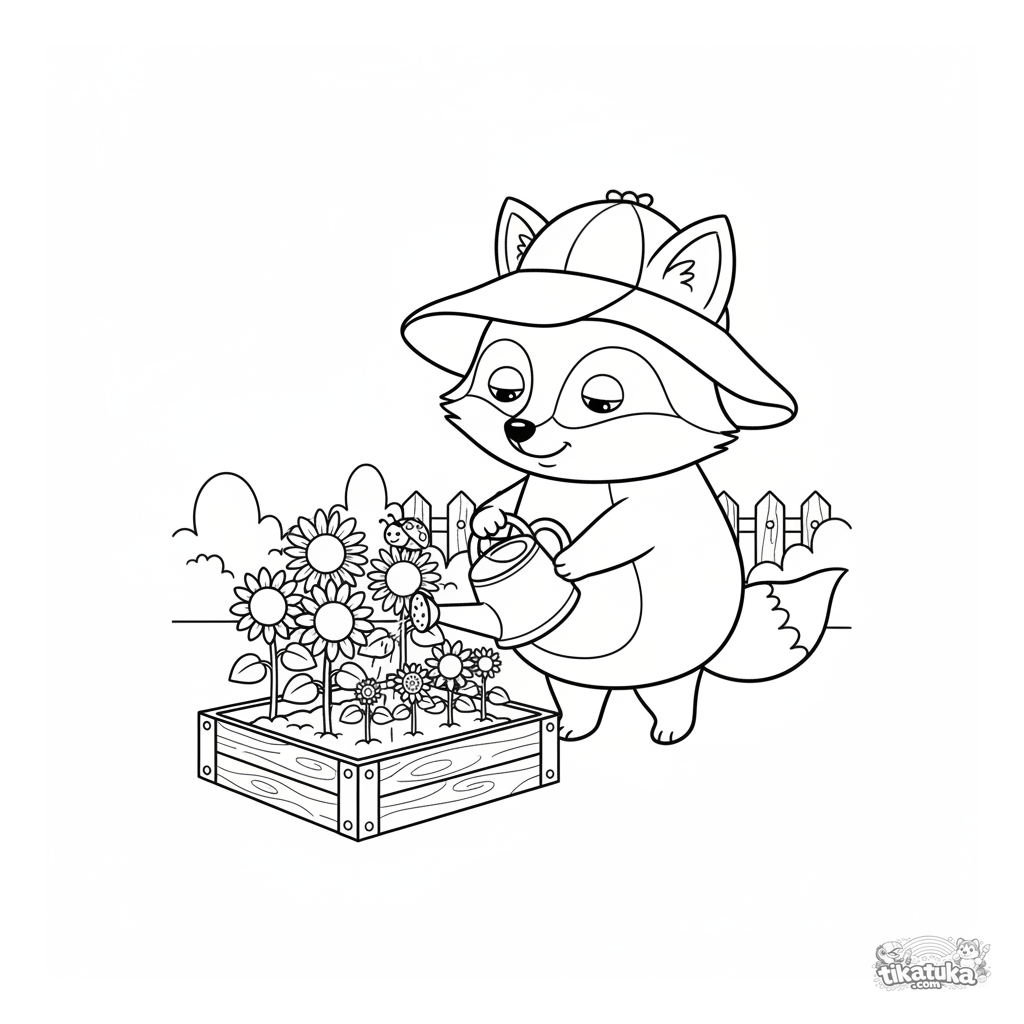 Página para colorir para crianças 3-7: a raposa Foxy com chapéu de jardineiro rega girassóis jovens. Cena de jardim calma e fofa.
