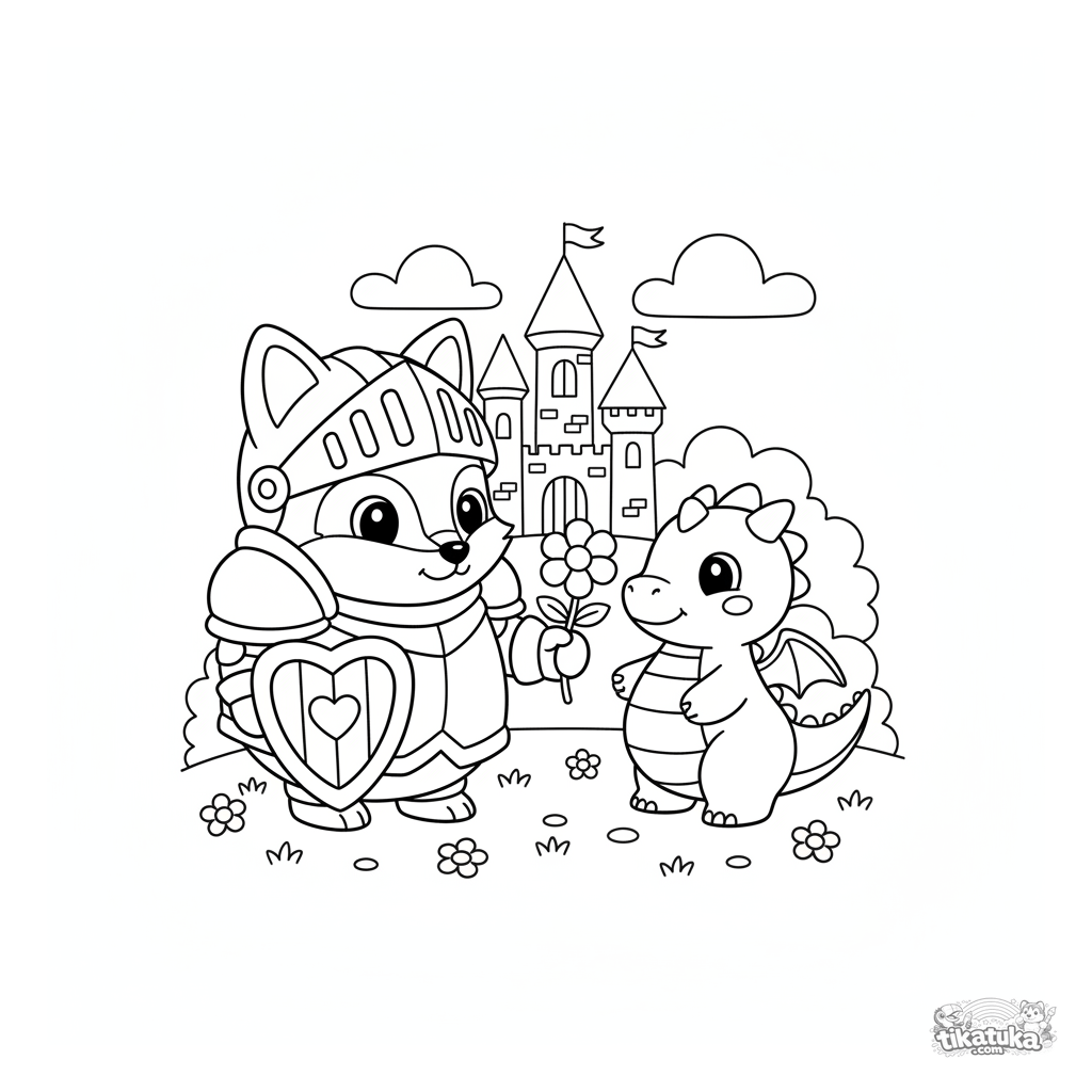 Página para colorir para crianças: a raposa cavaleiro Foxy fazendo amizade com um dragãozinho perto de um castelo. Estilo de mascote de pelúcia, formas suaves, detalhes seguros, margens amplas.