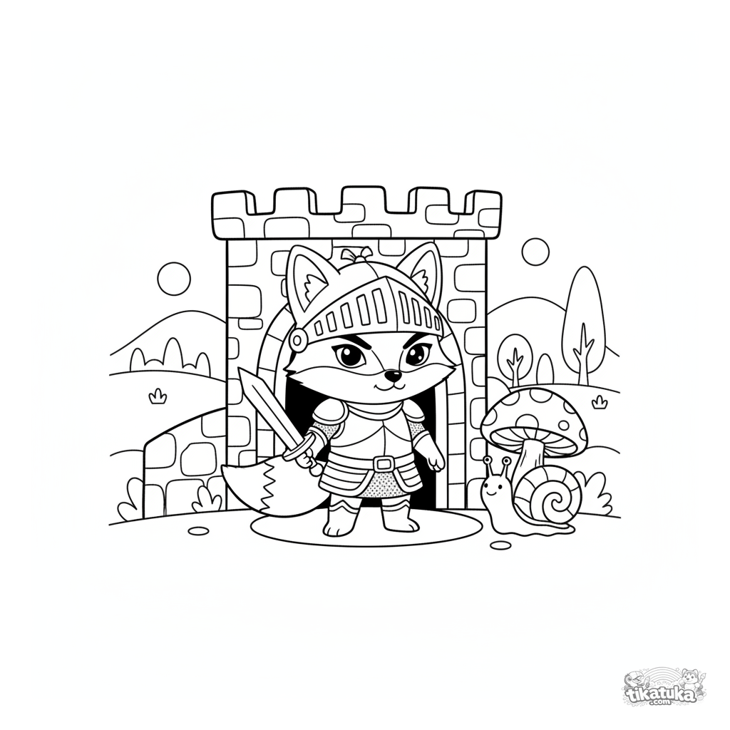 Página para colorir para meninos 4-8: a raposa Foxy em armadura de cavaleiro guarda o portão de um castelo de brinquedo. Formas simples e cena amigável.