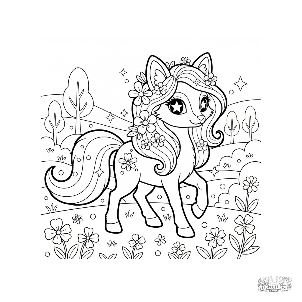 Página para colorir para meninas: o pônei mágico raposa Foxy trotando por um prado. Estilo boneco macio, crina floral, faíscas flutuantes.