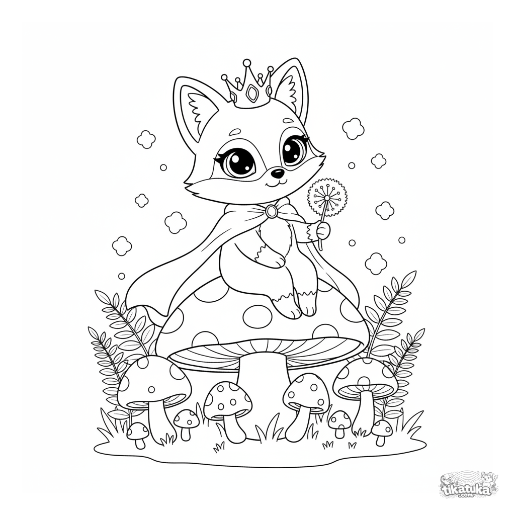 Página para colorir com a princesa raposa Foxy em uma floresta de cogumelos mágica. Para crianças de 4 a 6 anos. A princesa senta em um cogumelo grande cercado por samambaias.