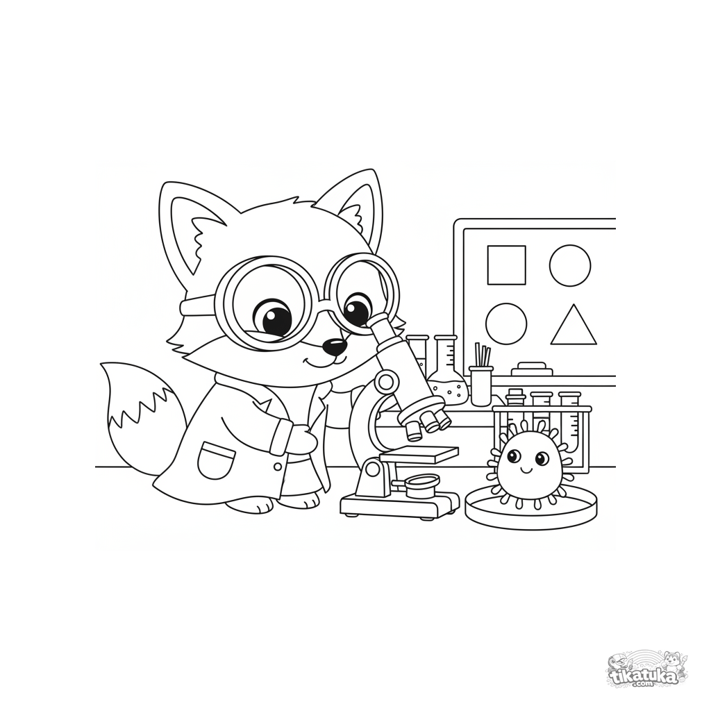 Página para colorir infantil: a raposa Foxy como cientista estudando um micróbio amigável em um laboratório. Estilo de boneco de pano, detalhes divertidos, ferramentas científicas simples, margens amplas.