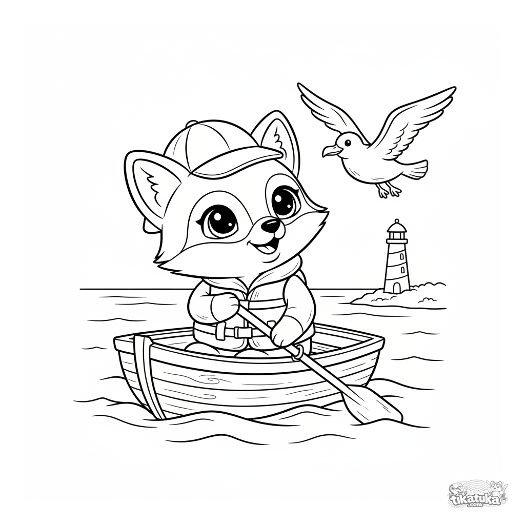 Página para colorir para crianças de 4-6 anos: Raposa Foxy como marinheiro desfrutando de um passeio em um barco a remos de madeira em um lago. Estilo de marionete macia, viagem aquática pacífica.