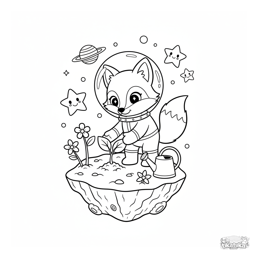 Página para colorir infantil: a raposa Foxy em traje espacial plantando flores em um asteroide no espaço. Estilo de boneco de pano, contornos limpos, margens amplas.