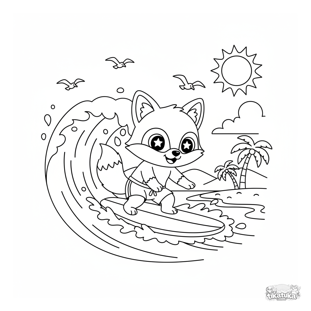 Página para colorir para crianças 5-9: a raposa Foxy em uma prancha de surf pega uma grande onda do oceano. Cena de praia dinâmica e divertida.