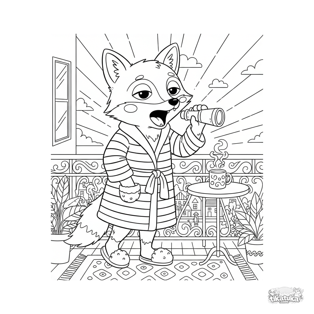 Página para colorir para crianças de 10-12 anos: uma raposa sonolenta de roupão listrado na varanda com binóculos, procurando o carteiro ao amanhecer. Cena aconchegante e engraçada no estilo rabisco de caderno.