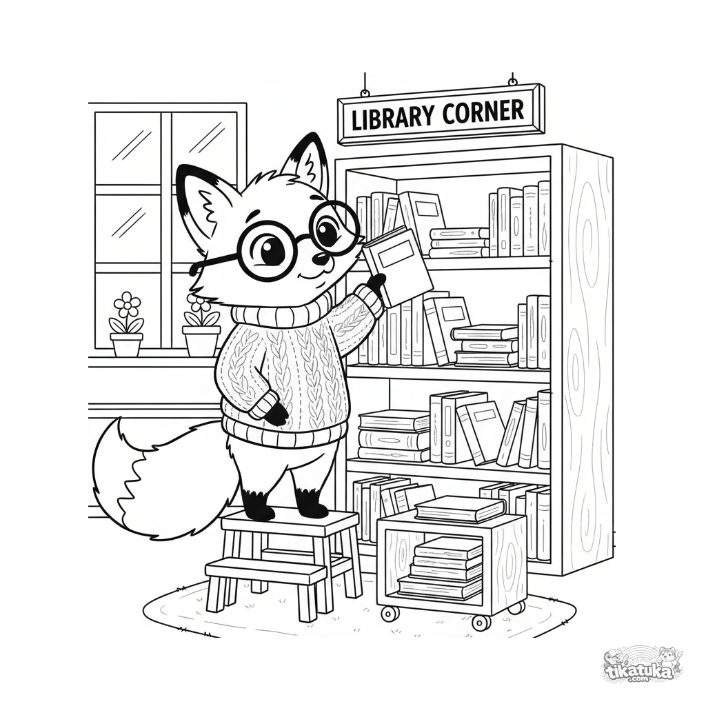 Página para colorir de uma raposa bibliotecária para crianças 4-6. Personagem esperto com óculos e suéter organiza livros na estante do cantinho da leitura.