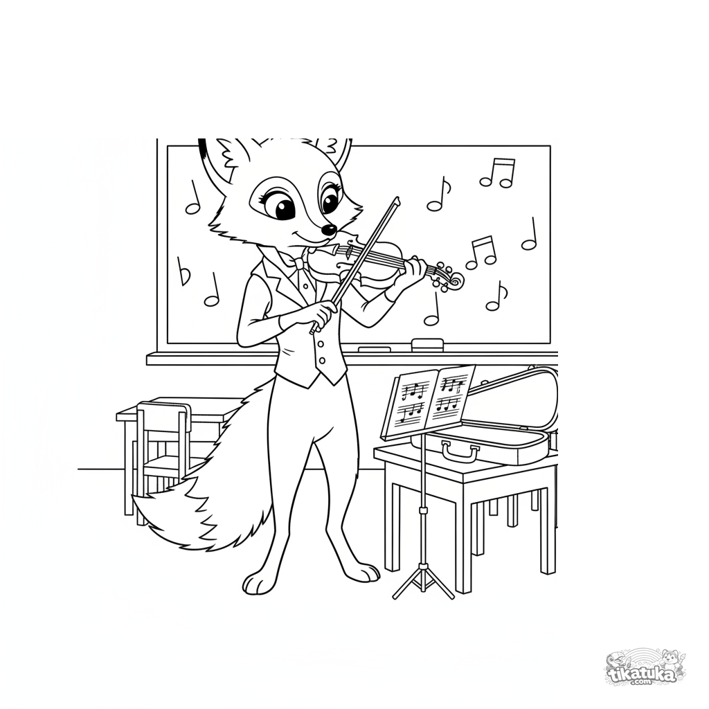 Página para colorir para 7-9 anos: uma elegante raposa músico de colete afina um violino na sala de aula perto de um quadro com notas. Detalhe moderado estilo Disney.