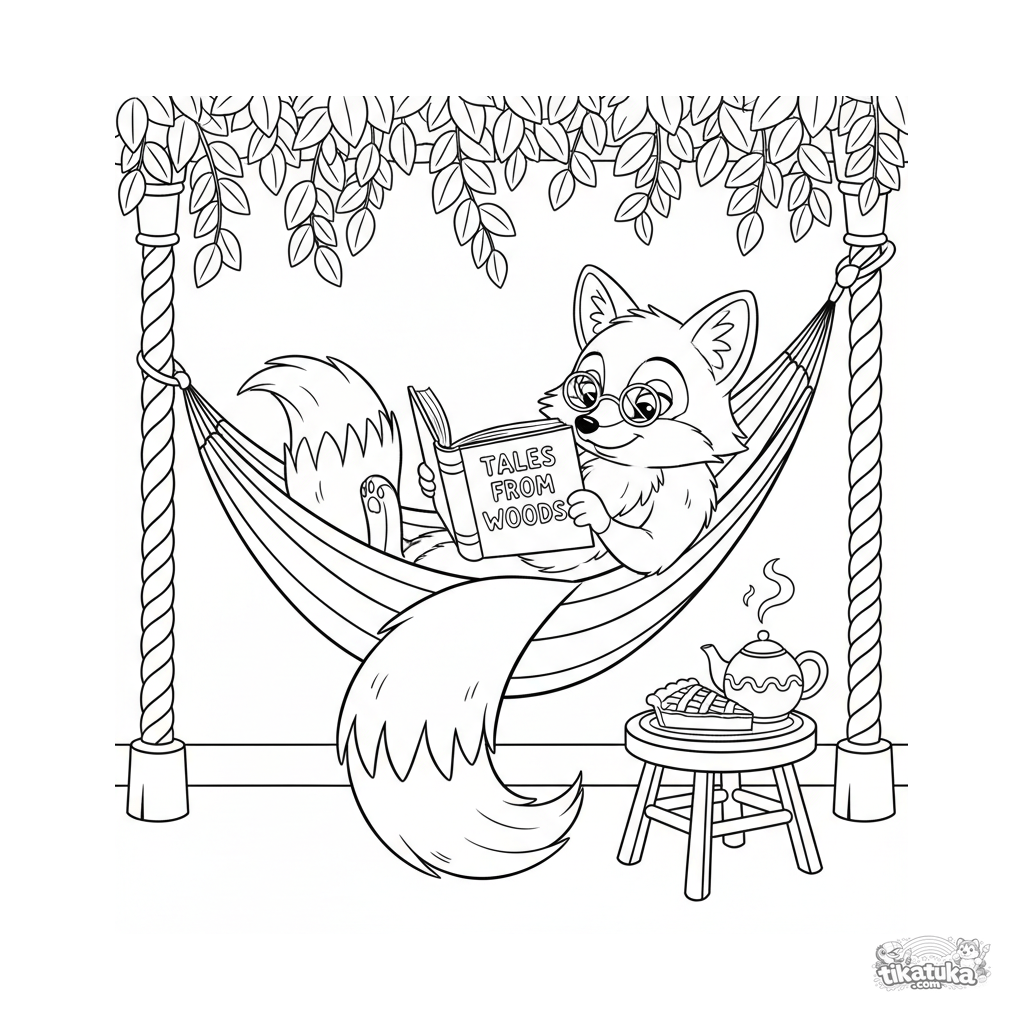 Página para colorir detalhada para crianças mais velhas de 10-12 anos: uma raposa relaxa em uma rede com um livro em uma varanda de verão aconchegante.