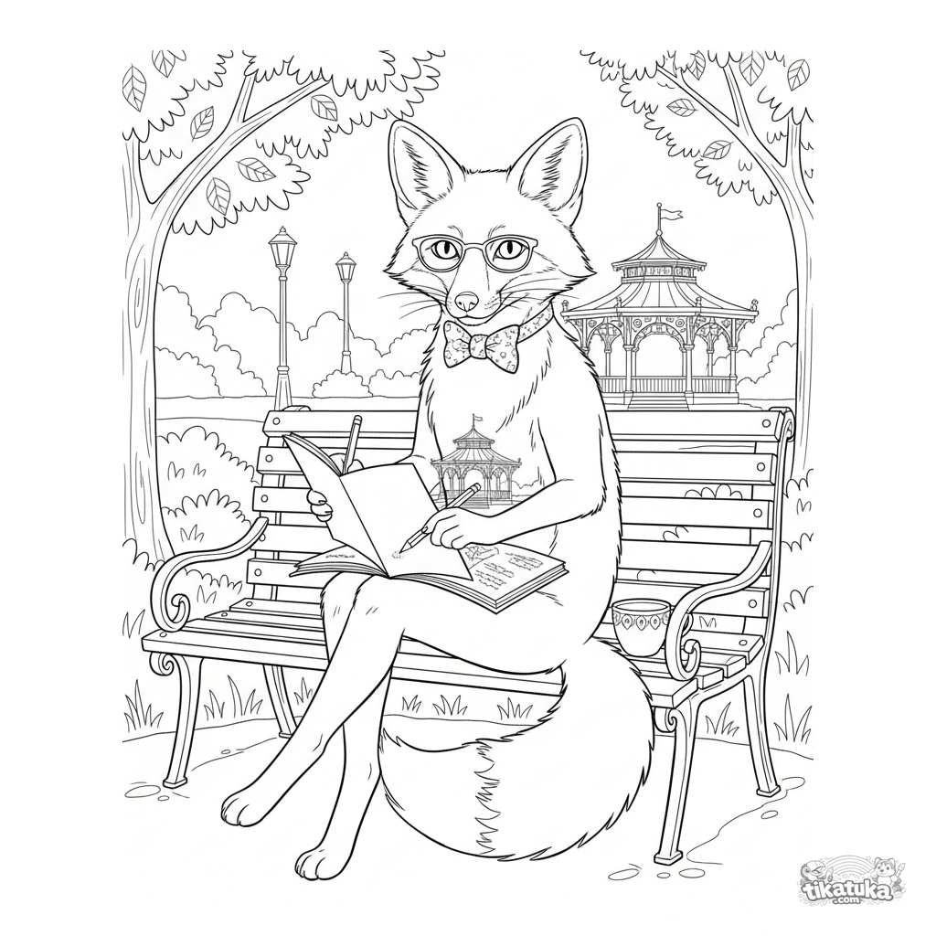 Página para colorir detalhada para crianças de 10-12 anos: uma raposa de óculos desenhando num caderno sentada num banco de parque. Estilo realista.
